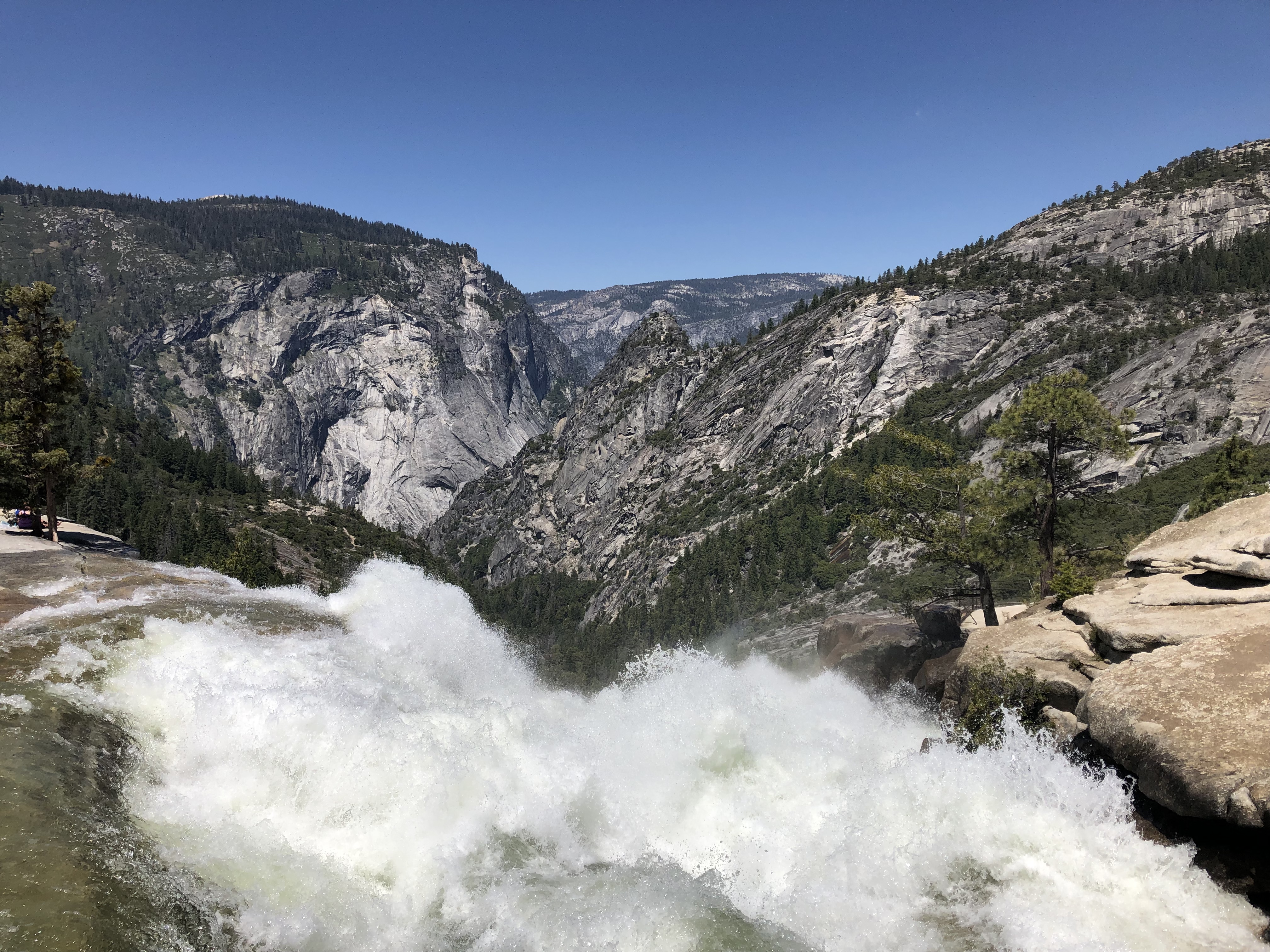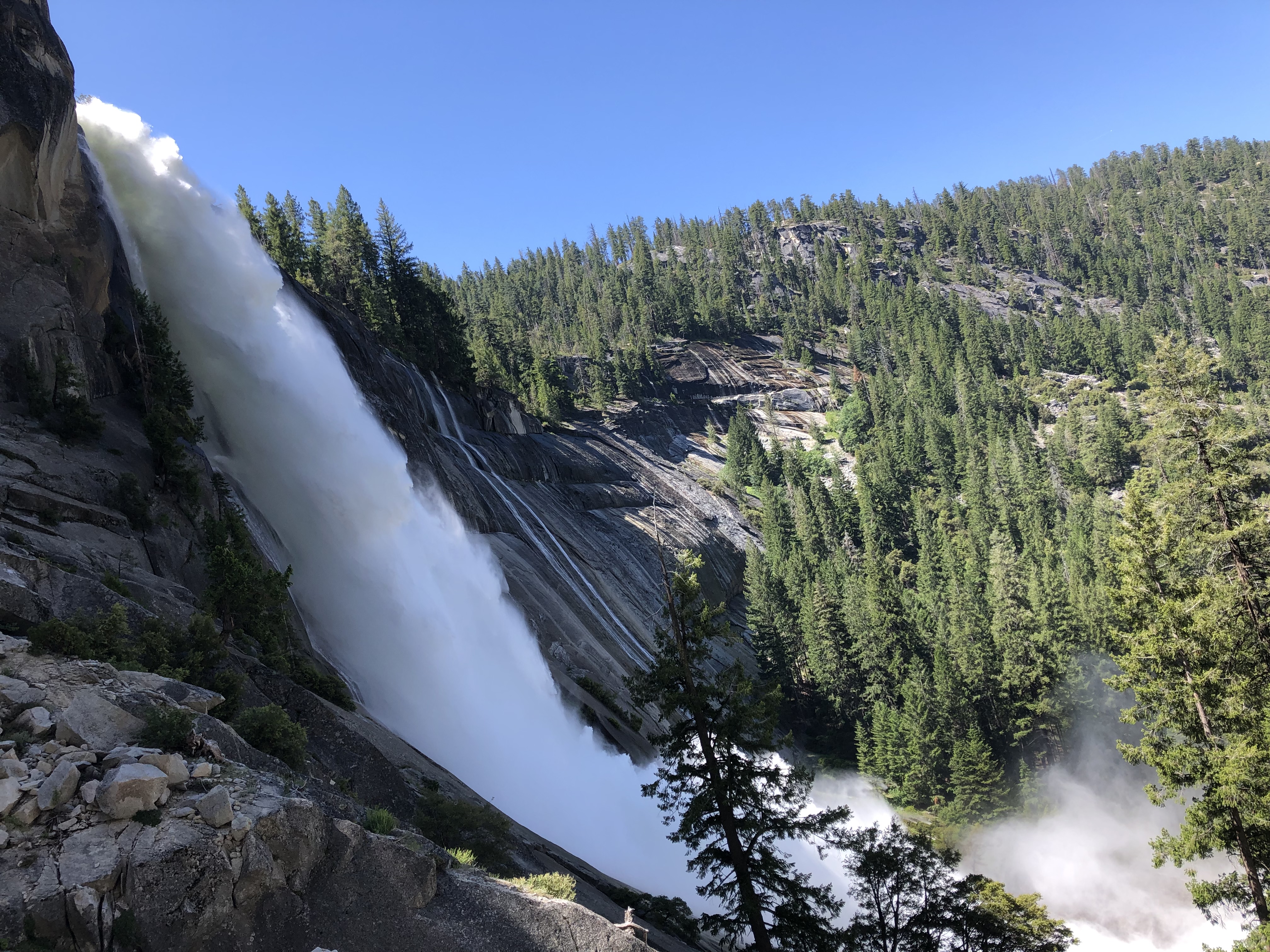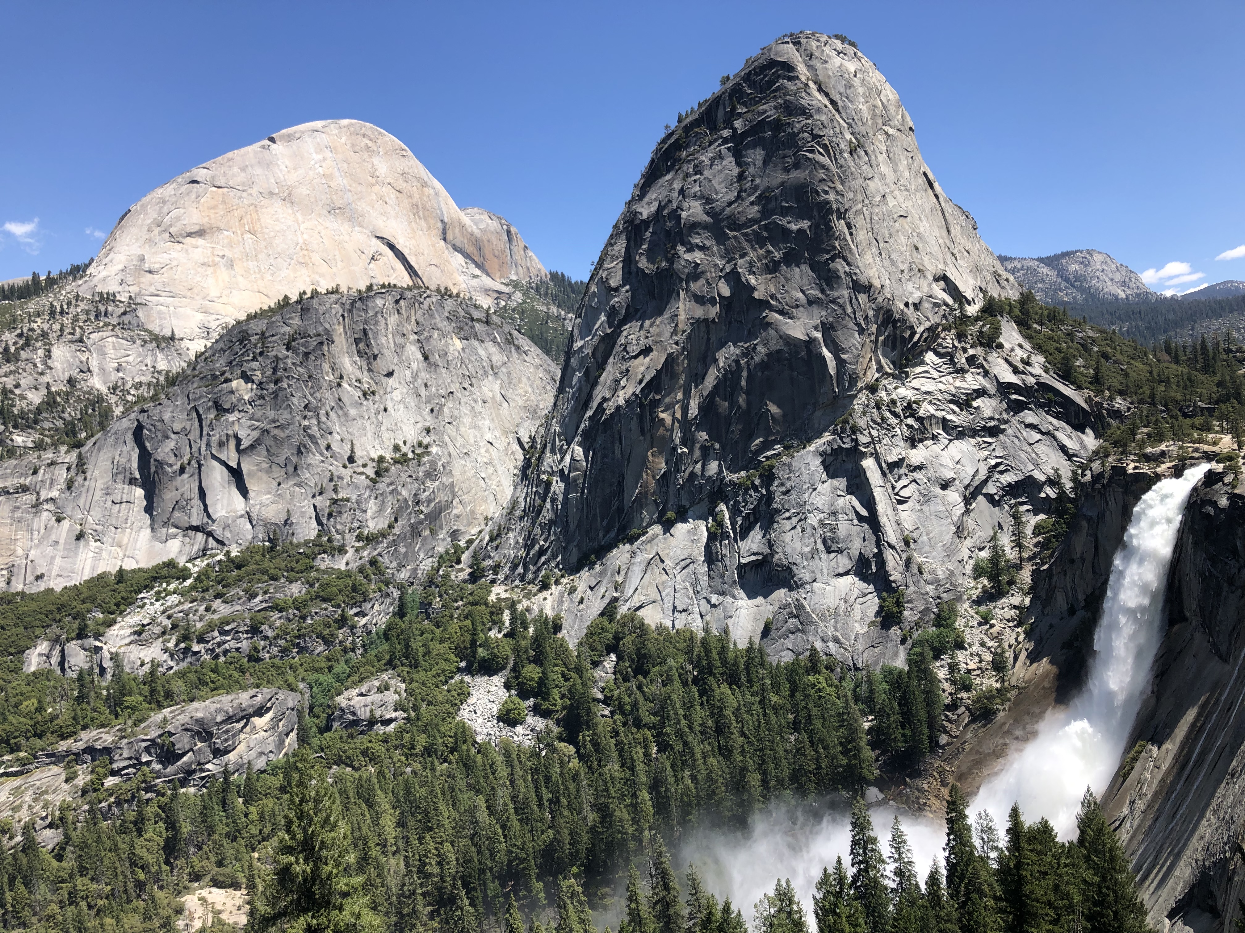 My personal favorite is Vernal and Nevada Falls via Mist Trail. This trail is approximately 6.4 miles loop with an elevation gain of 2,191 ft and rated as moderate. We went on this trail in mid-July. I underestimated this trail when I read that you WILL get wet on the way up to Vernal Falls. Lots of wet and narrow stairs! By the time we reached Vernal Falls I felt like I was in the middle of a storm. I was completely soaked from head to toe. Gear up and wear waterproof everything or at least wear something that dries up quickly. It took us five hours to complete the trail with plenty of time to rest at the top.