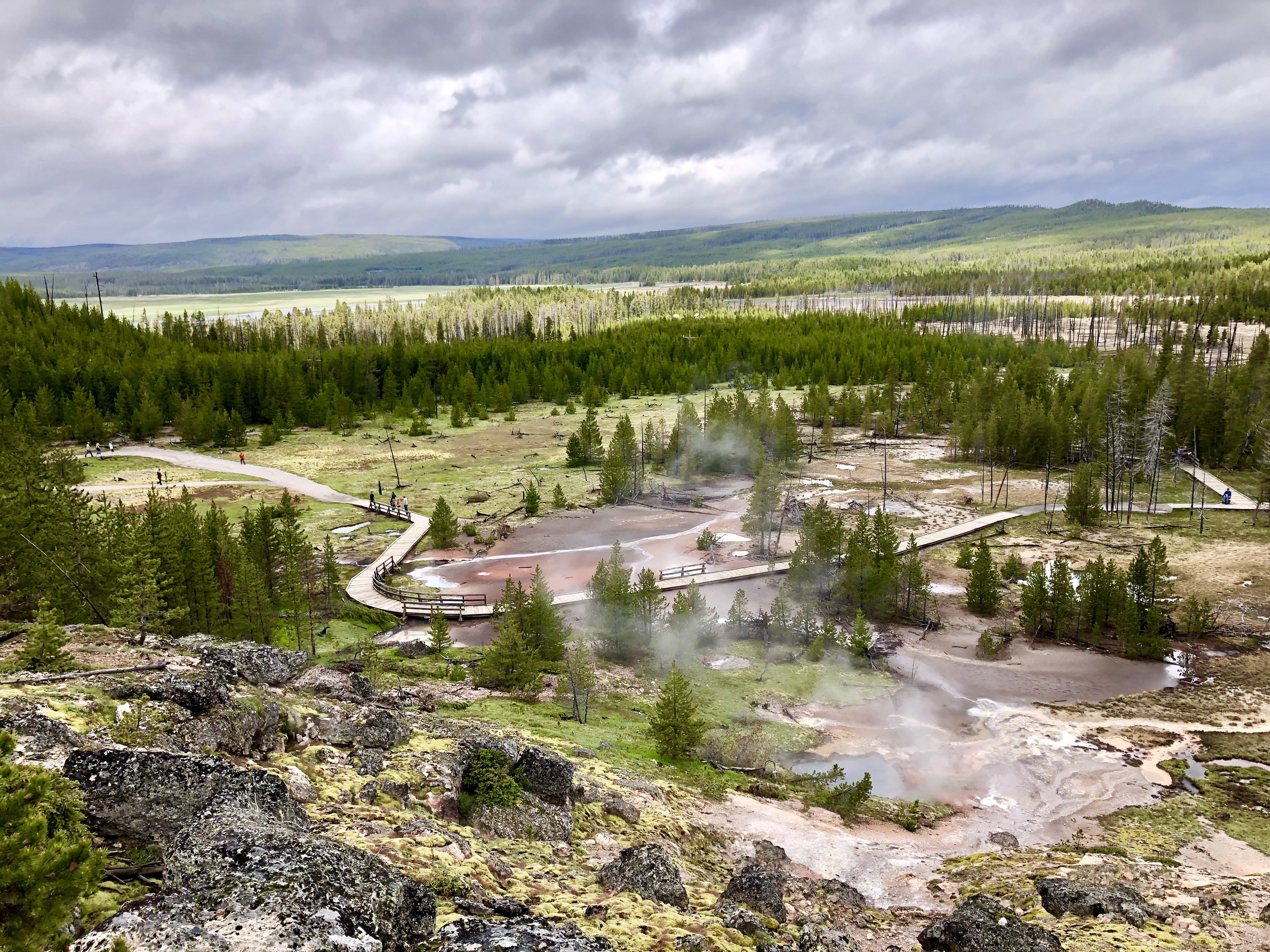 After breakfast, we had plenty of time to walk around Old Faithful area. I felt like this trip was the most relaxed trip we’ve ever taken because none of the trails were hard and we weren’t rushing to get from one place to another. After three days of seeing a ton of geysers and smelling rotten eggs I was getting bored and was hoping to see more wildlife. We took our time to watch Old Faithful, walked around the trail loop and went to see Grand Prismatic Spring. Unfortunately, we couldn’t view the Grand Prismatic Spring from the hill above because the trail was closed. It was hard to capture the spring due to the steam and heavily trafficked, narrow boardwalk. We left Yellowstone in the afternoon and headed down to Antler Inn in Jackson, WY to spend the night.